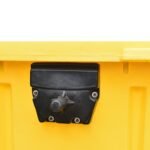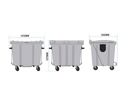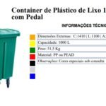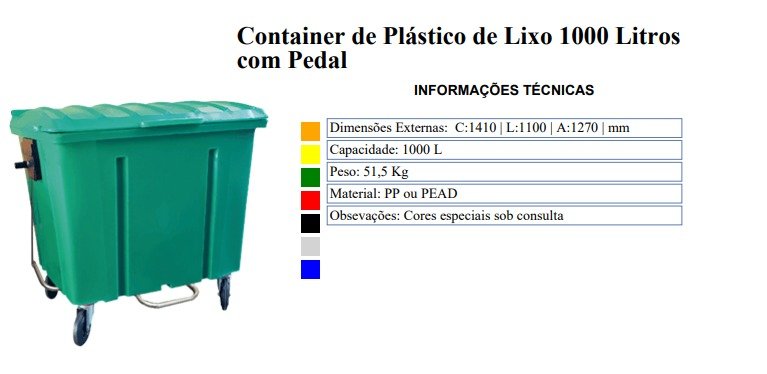 O Container de lixo 1000 litros com pedal é fabricado em polietileno de alta densidade (PEAD). Resistente ao impacto e à tração, possui proteção contra raios ultravioleta e contêm um aditivo extra antioxidante, o que lhe garante níveis de proteção classe 8 – UV 8, da American Society for Testing and Materials (ASTM), em conformidade com a norma EN840. Com rodas de borracha com 200mm de diâmetro (rodízio 8") e núcleo de polipropileno (PP). Possui 4 rodízios giratórios, sendo 2 com freios, e garfos em aço com tratamento anticorrosivo. Possui munhão em polietileno para basculamento lateral em caminhões de coleta urbana e dreno com tampa rosqueável para escoamento de líquidos. OPCIONAL: Munhão de aço. Maior resistência mecânica. OPCIONAL: Reforço em chapa de aço
