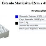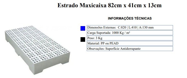 Informações Estrado 82cm x 41cm x 13cm Dimensões Ext:C:820 | L:410 | A:130 mm Carga Suportada:1000 Kg / m² Peso:3 Kg Material:PP ou PEAD Obsevações: Superfície Antiderrapante